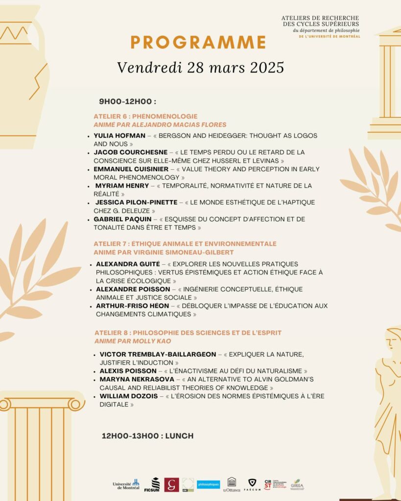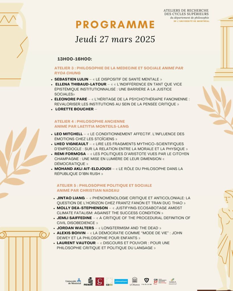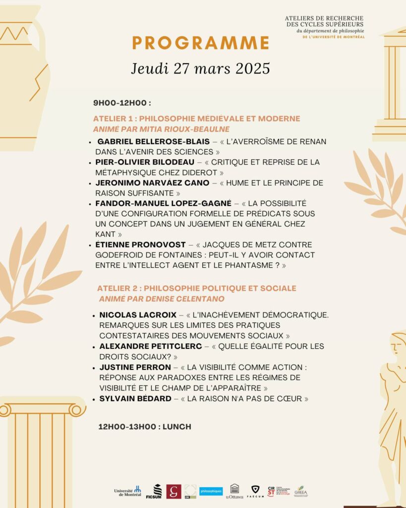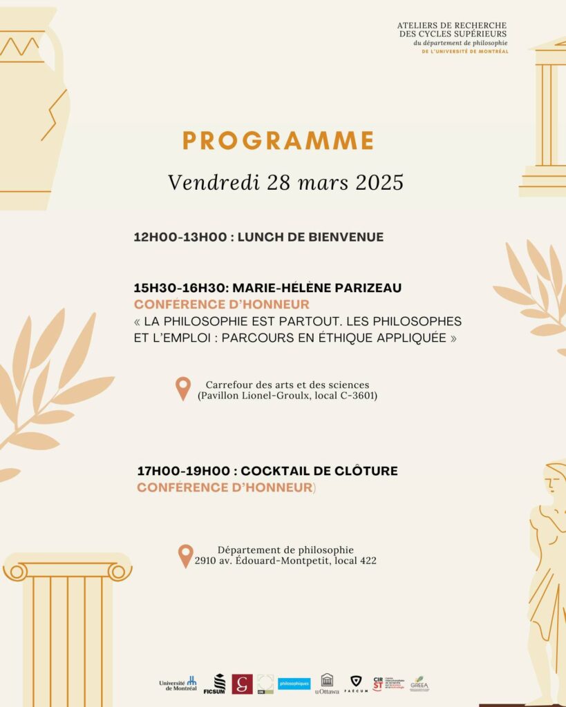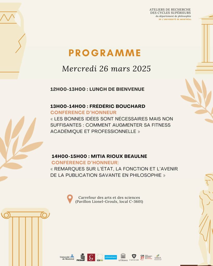 Invitation au cocktail de clôture : joignez-vous à nous pour célébrer la fin de notre colloque annuel : Vendredi 28 mars, 17h au local 422 du département de philosophie. Cette année, nous avons le plaisir de nous associer avec la revue Ithaque, qui profitera de l’occasion pour lancer son tout nouveau numéro 35 !