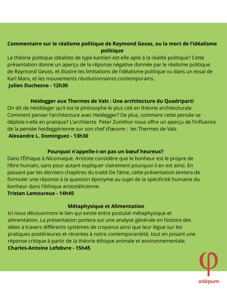 Les présentations se dérouleront de 12h30 à 17h00.