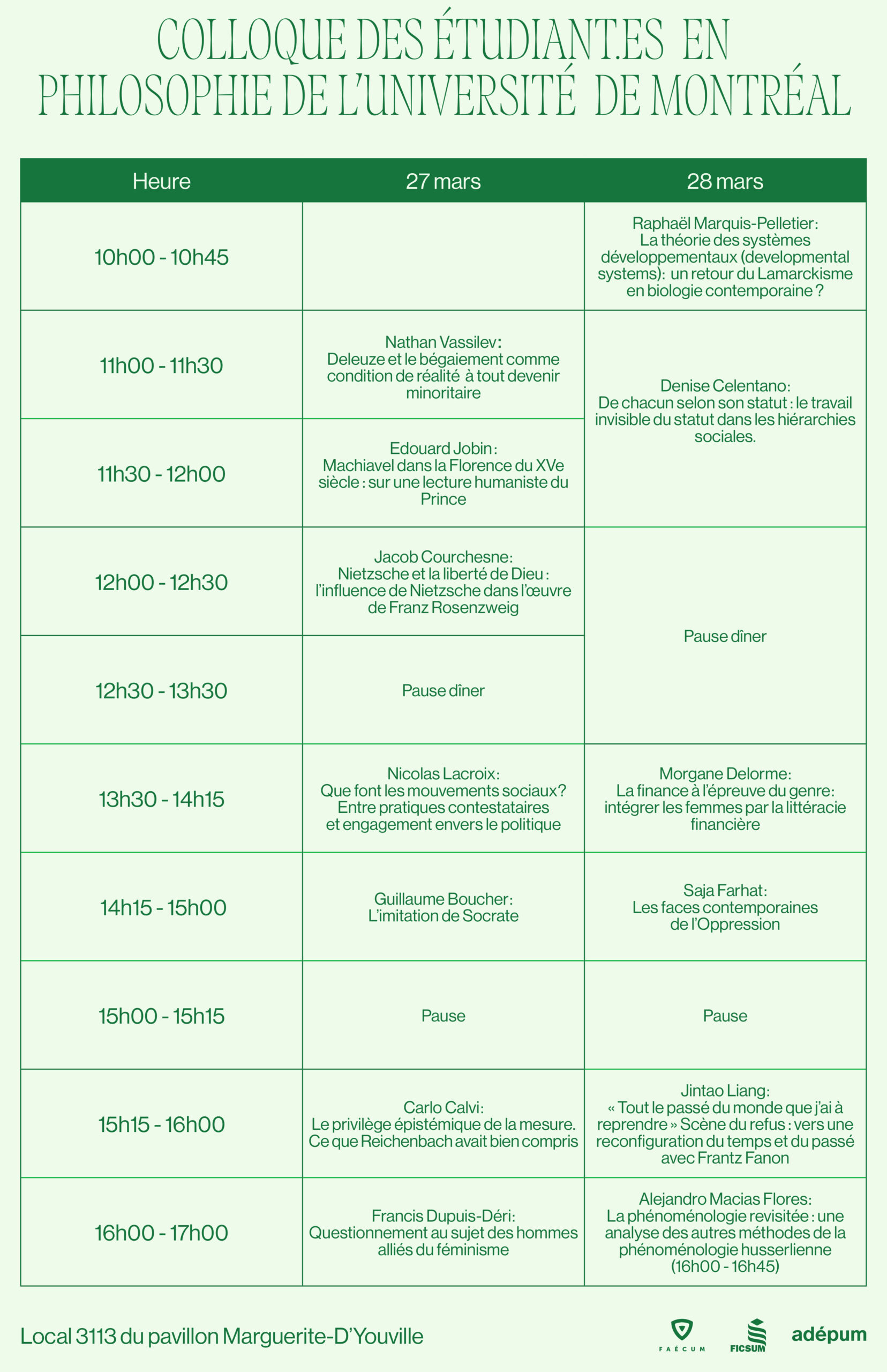 Les étudiant·es en philosophie de l’Université de Montréal sont heureux·ses de vous inviter à leur colloque annuel qui se tiendra les 27 et 28 mars 2024 au local 3113 du pavillon Marguerite-D’Youville. L’événement réunit des communications d’étudiant·es au premier cycle (mercredi matin) et d’étudiant·es aux cycles supérieurs (mercredi après-midi et jeudi).